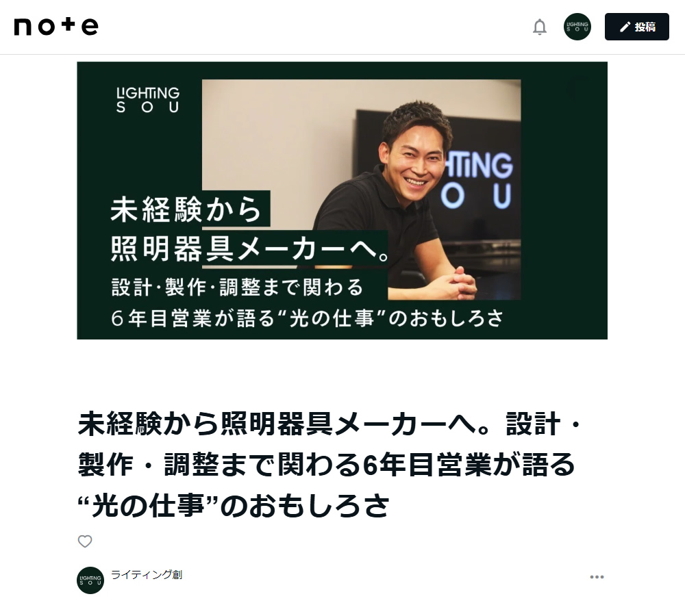 今回は「未経験から照明器具メーカーへ。設計・製作・調整まで関わる6年目営業が語る“光の仕事”のおもしろさ」と題して、弊社社員へインタビューを行い、未経験からでも挑戦できるライティング創の職場環境や、「照明器具メーカーの営業」の魅力についてお伝えしています。ご興味ある方はご覧頂ければ幸いです。