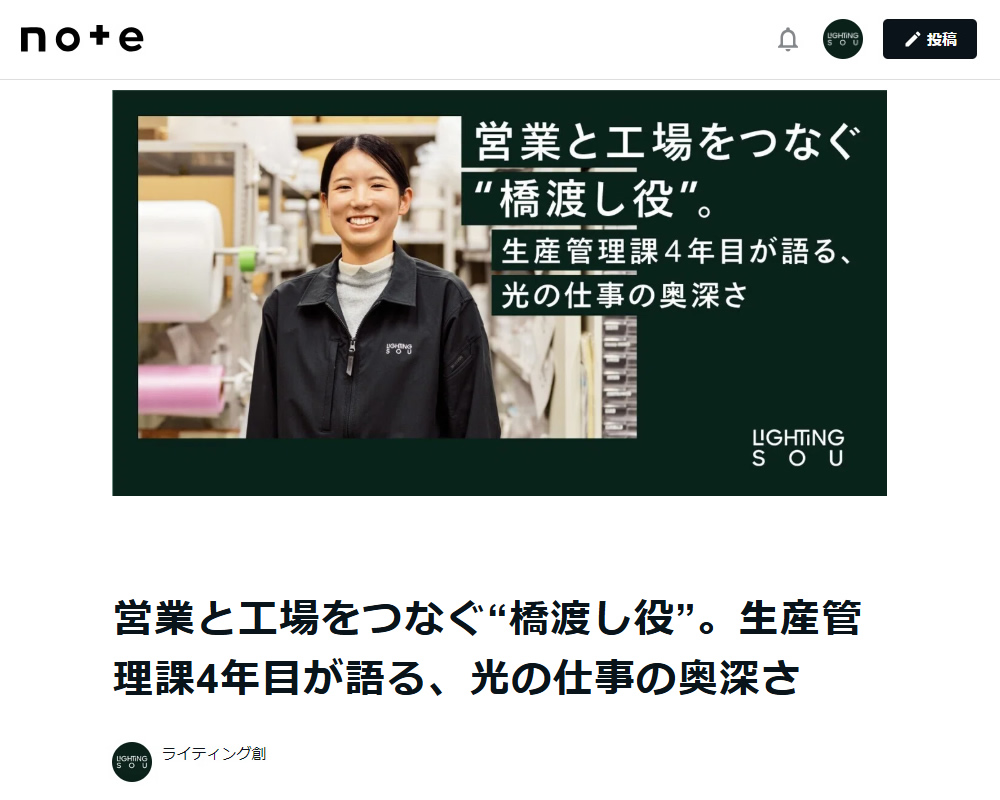 今回は「営業と工場をつなぐ“橋渡し役”。生産管理課4年目が語る、光の仕事の奥深さ」と題して、弊社社員へインタビューを行い、スケジュール調整や部品手配などの生産管理の仕事や、自然体で働けるというライティング創の魅力についてお伝えしています。ご興味ある方はご覧頂ければ幸いです。