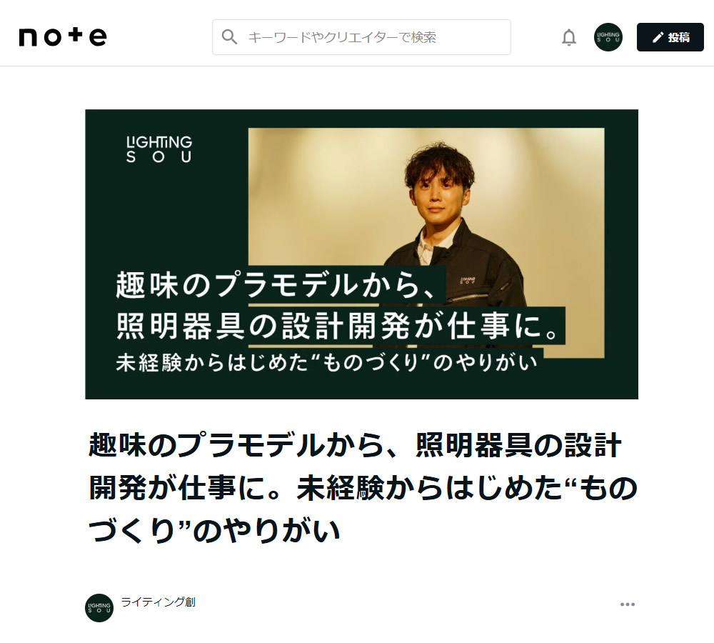 今回は「趣味のプラモデルから、照明器具の設計開発が仕事に。未経験からはじめた“ものづくり”のやりがい」と題して、業界職種共に未経験からキャリアをスタートした弊社社員へインタビューを行い、照明器具の設計開発の仕事の魅力についてお伝えしています。後半では、弊社ライティング創で働くことについてもお話しております。ご興味ある方はご覧頂ければ幸いです。
